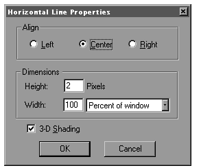 You can insert a horizontal line by selecting the horizontal line button on the Character Format toolbar or by selecting Horizontal Line from the Insert menu. Once the line is inserted, you can right click on it to get a pop-up menu and then select Horizontal Line Properties to get the horizontal line properties dialog box, which looks like Figure 13.12.