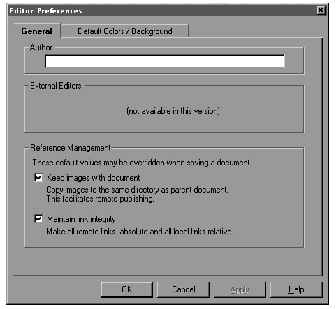The general options include the default author of documents, as well as two options: Keep images with document (to copy all images to your local hard disk) and Maintain link integrity (to adjust links to work regardless of whether the file is saved locally or published to a Web site on the Internet).