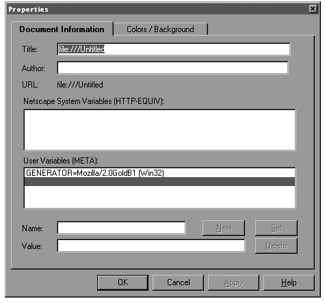 The document properties dialog box (in the Properties menu) enables you to set up several features of your HTML document, including header information, such as the title and the color and background information for the BODY tag.