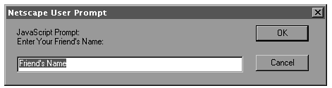 <HTML> <HEAD> <TITLE>Example 3.2</TITLE> <SCRIPT LANGUAGE="JavaScript"> <!--HIDE FROM OTHER BROWSERS var name=prompt("Enter Your Name:","Name"); alert("Greetings " + name + "."); name=prompt("Enter Your Friend's Name:","Friend's Name"); // STOP HIDING FROM OTHER BROWSERS --> </SCRIPT> </HEAD> <BODY> <SCRIPT LANGUAGE="JavaScript"> <!-- HIDE FROM OTHER BROWSERS document.write('<IMG SRC="welcome.gif">'); document.write("<H1>Greetings, " + name + ". Welcome to Netscape å Navigator</H1>"); // STOP HIDING FROM OTHER BROWSERS --> </SCRIPT> </BODY></HTML>