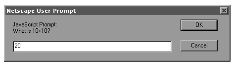 <HTML> <HEAD> <TITLE>Example 3.4</TITLE> <SCRIPT LANGUAGE="JavaScript"> <!-- HIDE FROM OTHER BROWSERS // DEFINE VARIABLES FOR REST OF SCRIPT var question="What is 10+10?"; var answer=20; var correct='<IMG SRC="correct.gif">'; var incorrect='<IMG SRC="incorrect.gif">'; // ASK THE QUESTION var response = prompt(question,"0"); // chECK THE ANSWER THE FIRST TIME if (response != answer) { // THE ANSWER WAS WRONG: OFFER A SECOND chAncE if (confirm("Wrong! Press OK for a second chance.")) response = prompt(question,"0"); } // chECK THE ANSWER var output = (response == answer) ? correct : incorrect; // STOP HIDING FROM OTHER BROWSERS --> </SCRIPT> </HEAD> <BODY> <SCRIPT LANGUAGE="JavaScript"> <!-- HIDE FROM OTHER BROWSERS // OUTPUT RESULT document.write(output); // STOP HIDING FROM OTHER BROWSERS --> </SCRIPT> </BODY></HTML>