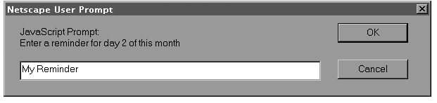 The program (see Listing W4.1) displays a calendar of the current month, much the same as in Dave Eisenberg's calendar example. When users click on any of the days in the calendar, they either can enter a reminder for that day, or are alerted of their previously entered reminder.